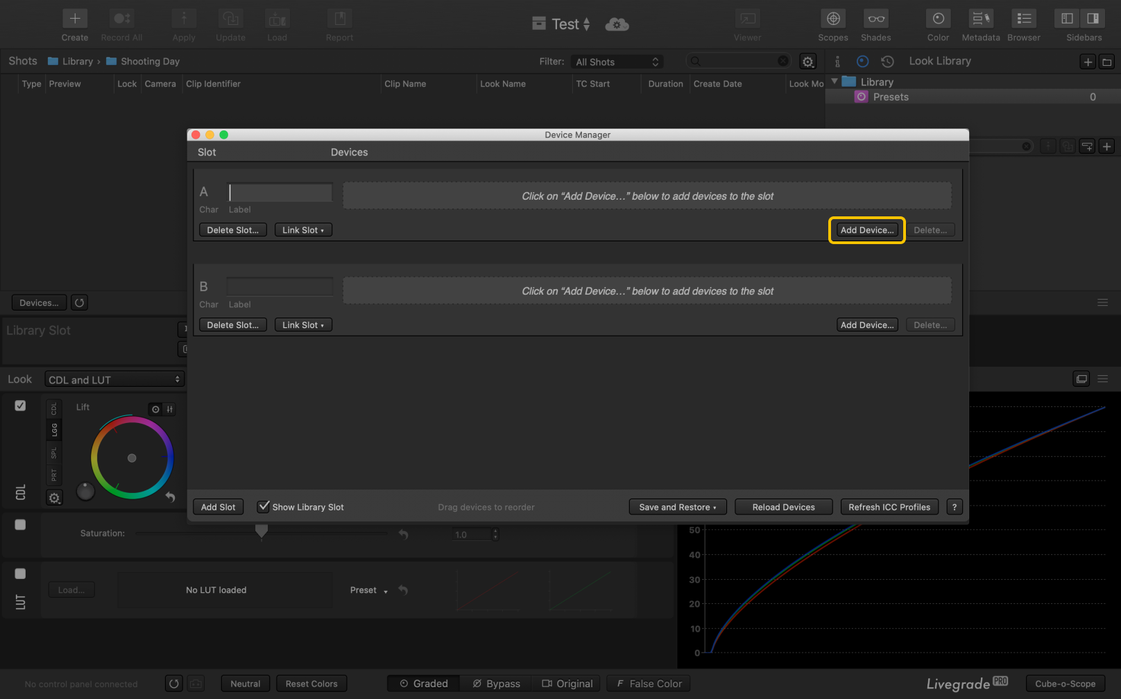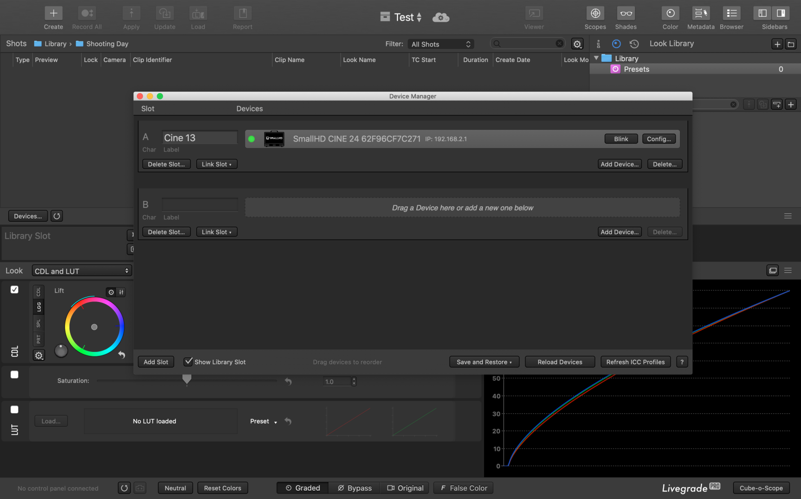 - When properly configured, a green button will appear next to the SmallHD device within the Device Manager, indicating an active connection between your computer and the monitor. Return to the main Livegrade window, and your SmallHD monitor will now be displayed as a device within the Grading Slot.