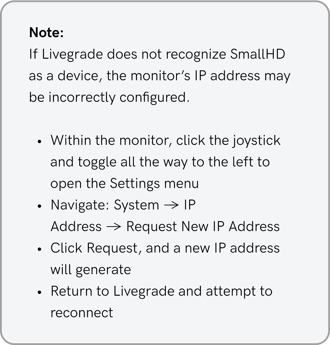 If the SmallHD device does not appear, manual configuration may be necessary: