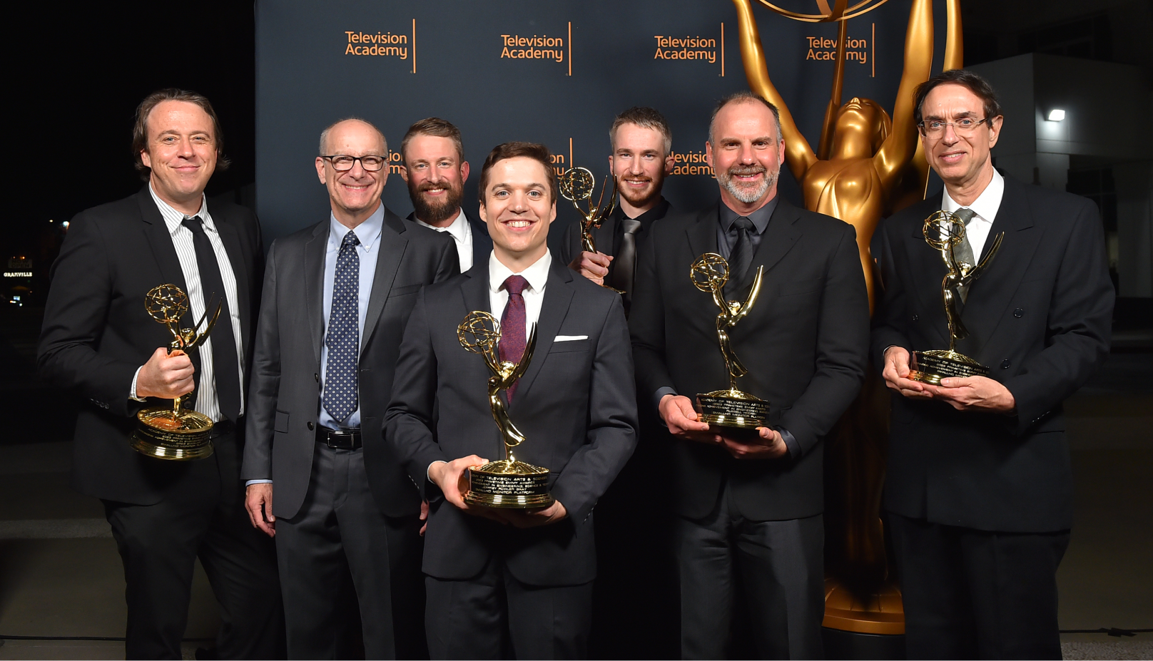 Greg Smokler, from left, Blake Johnson, Graham Phillips, Jeffrey Fowler Gray, Barrett Phillips, Russell Hocken and Norbert Ingram at the 75th Emmy Engineering, Science and Technology Awards on Wednesday, October 18, 2023 at the Television Academy’s Saban Media Center in Los Angeles. (Photo by Jordan Strauss/Invision for The Television Academy/AP Images)